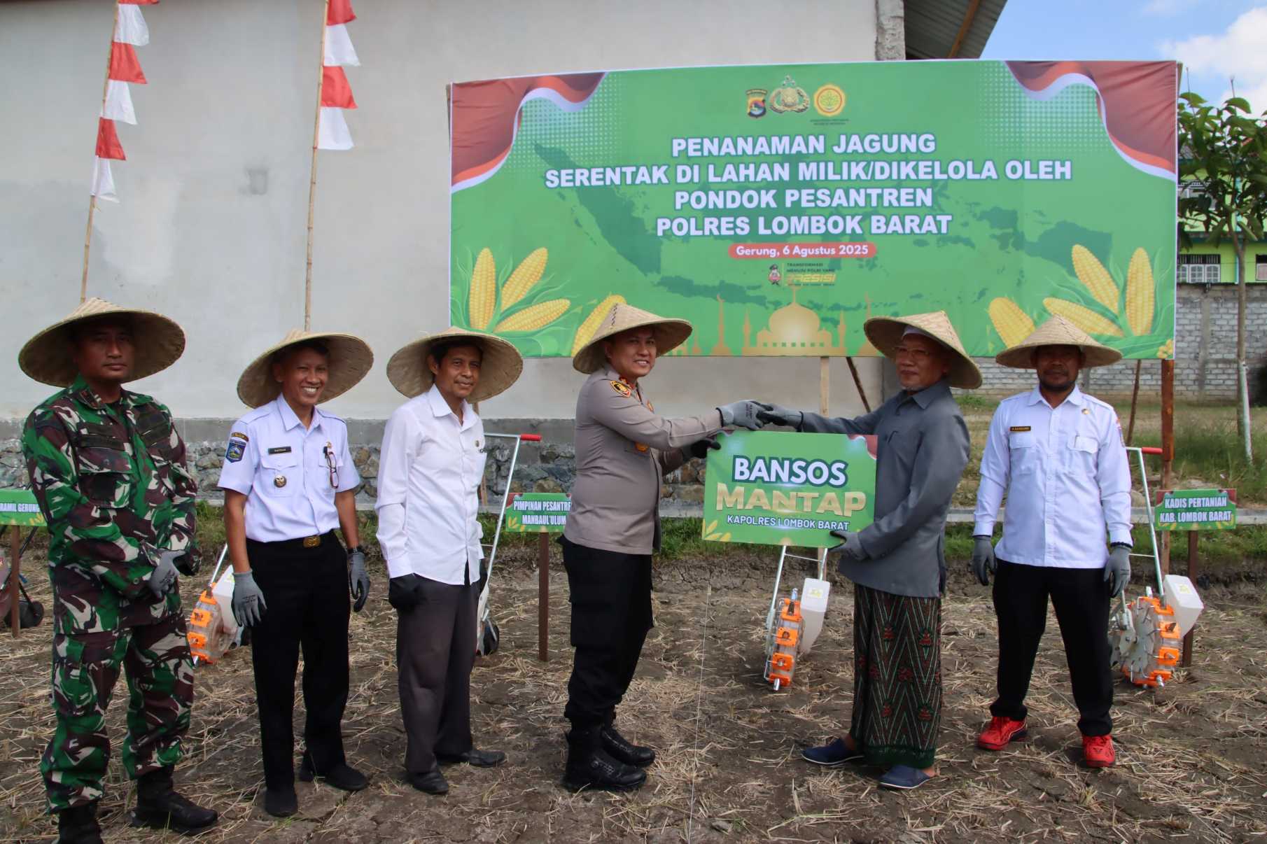Gerung, Lombok Barat – Kepolisian Resor Lombok Barat (Polres Lombok Barat) bersama dengan Pondok Pesantren (Ponpes) Man’baul Ulum menggelar acara penanaman jagung serentak di lahan milik atau yang dikelola oleh Ponpes yang berlokasi di Dusun Dasan Ketujur, Desa Mesanggok, Kecamatan Gerung, Kabupaten Lombok Barat, Rabu (6/8/2025).